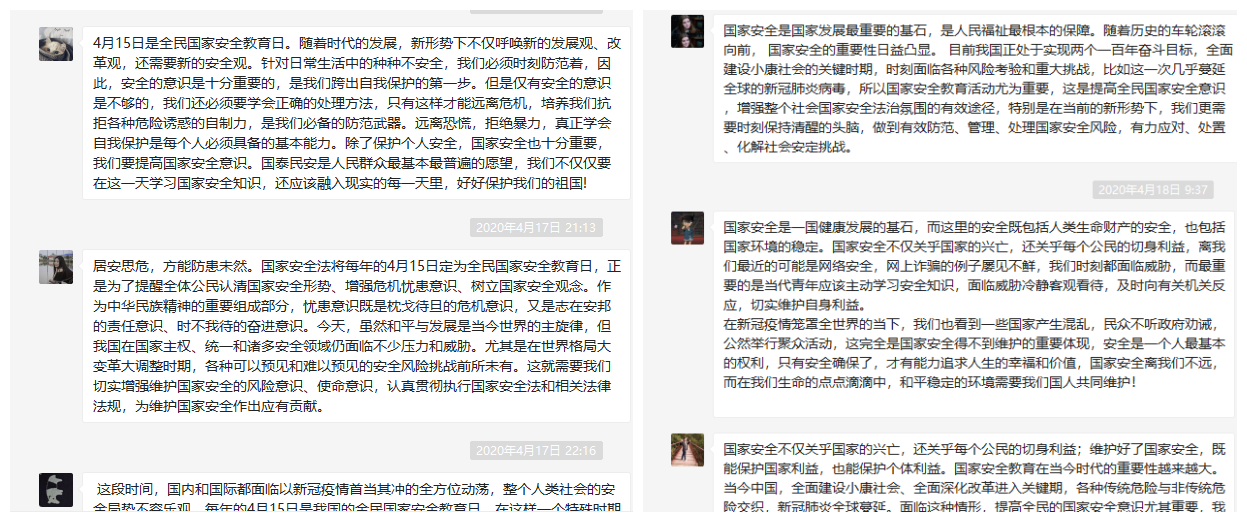 随后,全体支部党员在线观看了国家安全教育日短片,并下载相关资料进行自学,在党员群内分享学习心得进行交流。罗浩宇同志表示,国际与国内都面临着新冠肺炎带来的威胁,大众的国家安全意识已被唤醒,4月15日的国家安全教育日则更加深了这一意识;除此之外,随着经济文化的腾飞,中国已逐渐走向世界舞台中央,面临的风险与挑战更加多元化,因此也要求国民与时俱进,在多方面提高安全意识。谭雄同志表示,国、家与个人的联系非常密切,因此维护国家安全是我们每个公民的义务。当前正值全面建设小康社会关键时期,大家更应该提高风险意识,对于各种传统与非传统的威胁都防患于未然。陶杰同志表示,通过此次的主题活动,我们更加深入了解了新时代总体国家安全观,增强了维护国家安全的意识。身为党员,我们更要以身作则,切实维护国家的安全与利益,以人民安全与幸福为基点,积极行动。