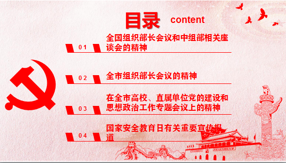 首先,支部书记介绍学习内容:学习全国组织部长会议和中组部相关座谈会的精神,以及六个方面的组织任务;学习全市组织部长会议的精神:总结十九大以来的工作,并叮嘱党员同志身上的使命担当,积极务实工作,促使工作高效、有序的进行;学习全市高校、直属单位党的建设和思想政治工作专题会议精神,要确保2020工作重点任务落实落地,明确并落实党建和思政工作的总体要求和主要内容;学习国家安全教育日有关内容,结合国情,深入了解国家安全教育日的内容、意义和要求。
