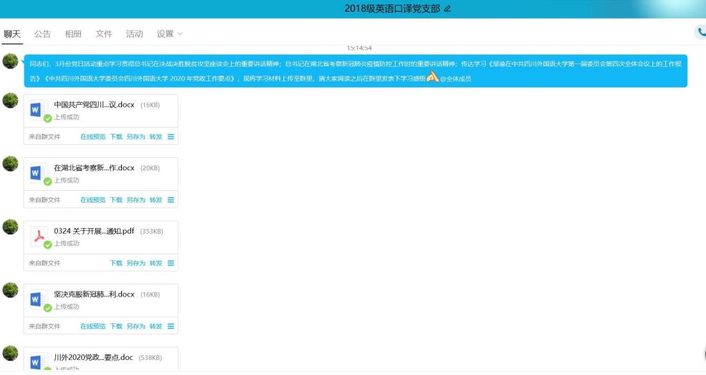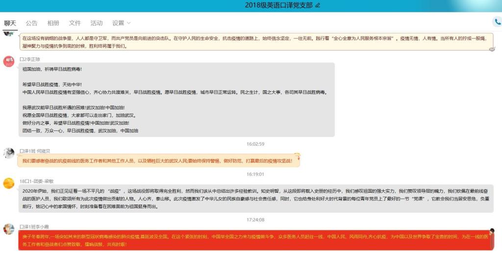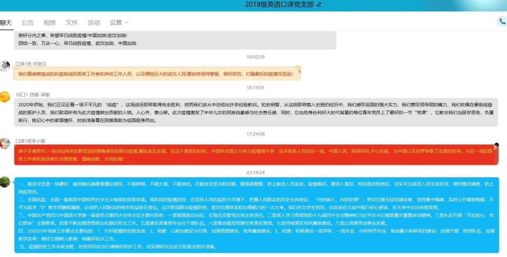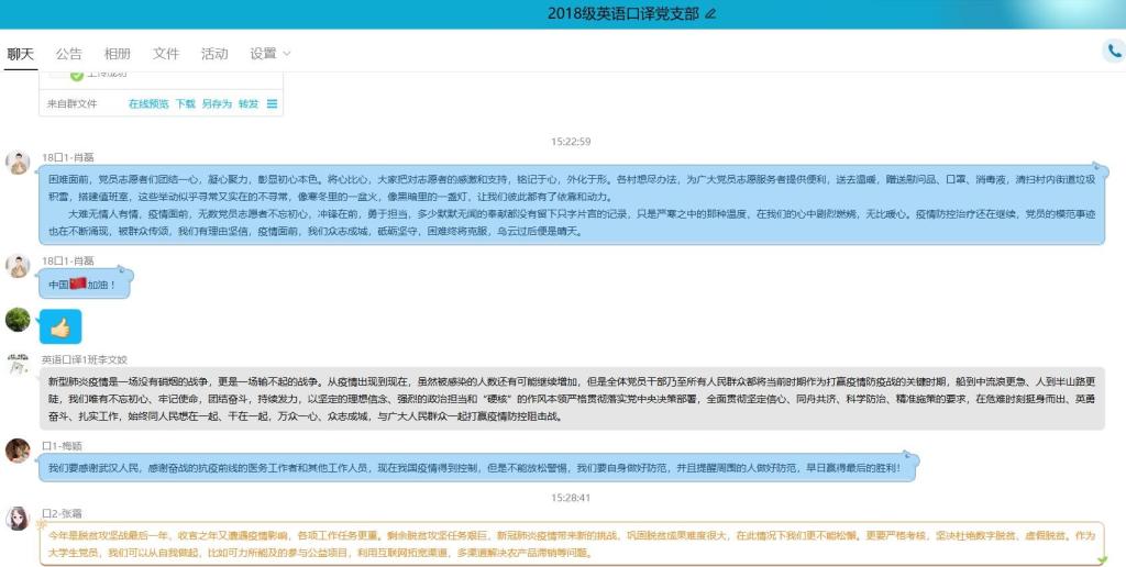 为深入学习贯彻习近平总书记关于疫情防控工作的重要讲话和指示批示精神,落实中央、市委以及学校党委、44118太阳成tyc城集团党总支相关部署要求,巩固深化“不忘初心、牢记使命”主题教育成果,3月31日下午44118太阳成tyc城集团2018级MTI英语口译党支部全体成员在支部QQ群开展了网上党日活动,支部全体成员参与。