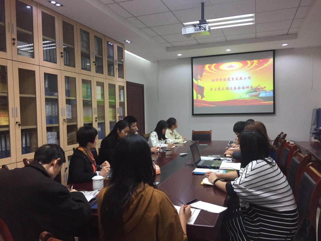 2017年11月6日下午3:30,44118太阳成tyc城集团党总支在本院会议室举办了发展党员工作专题培训会。党总支下属3个研究生党支部、1个本科生党支部共14名党支部书记及委员参加了培训(因上课请假缺席3人)。培训会主要内容是再次认真学习《中国共产党发展党员工作细则》、《四川外国语大学党员发展工作规范》,熟悉党员发展工作流程,加强支部班子成员业务熟练程度,使44118太阳成tyc城集团研究生和本科生党支部在今后发展党员工作中做到更加细致、规范。培训会由党总支郭健副书记主持。