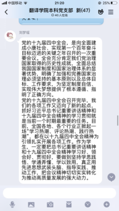 刘梦瑶同志认为,作为学生,一定要把习近平总书记重要讲话精神和党的十九届四中全会精神学习好、领会好、贯彻好,要做到坚持学思践悟、学通弄懂、学以致用,真正用先进思想武装头脑、指导实践、推动工作,把会议精神切切实实转化为推动高质量发展的强大动力。