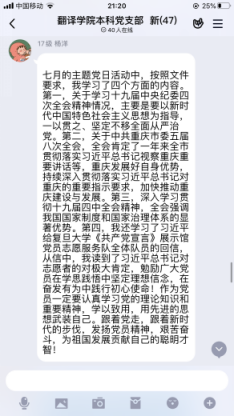 本次活动中,马洪洲同志通过社交平台引导党员们自学,通过观看专题学习视频、研读相关讲话精神等方式,重点学习了“十九届中央纪委四次全会精神情况”、“市委五届八次全会情况”、“十九届四中全会精神专题学习视频”、“习近平给复旦大学《共产党宣言》展示馆党员志愿服务队全体队员的回信”等内容。