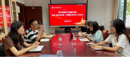 团总支书记张信就新学期学院团学工作重点进行了介绍;本科学生支部书记姚沁以上学期所带年级的读书会以及班级晨读推进激励机制介绍了自己的特色亮点做法;研究生MTI支部书记王品就迎新报道、新生安全教育、新生党员以及党支部教育管理工作进行了交流发言。