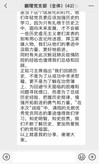 最后,支部书记张信同志强调了党史国史是党执政兴国的根基与血脉,我们学生党员要正确了解党和国家历史上的重大事件和重要人物,反对历史虚无主义,才能保证党和国家的根基永固,血脉永续,确保党始终成为中国特色社会主义事业的坚强领导核心,坚定不移走中国道路、弘扬中国精神、凝聚中国力量,实现中华民族伟大复兴的中国梦。最后,她还就疫情期间返校做了详细说明,希望大家在返校过程中做好防护,平安到校,并在接下来的学习生活中继续做好相关的防控工作。
