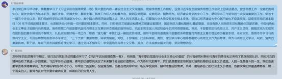 然后是深入学习《习近平谈治国理政》第一卷第五、六、七、八章,内容包括:第五章“建设法治中国”;第六章“建设社会主义文化强国”;第七章“推进社会事业和社会管理改革发展”;第八章“建设生态文明”。徐幸幸同志在着重学习第六章后,体会到:“只有物质文明建设和精神文明建设都搞好,国家物质力量和精神力量都增强,全国各族人民物质生活和精神生活都改善,中国特色社会主义事业才能顺利向前推进。”认为:“新干部、年轻干部尤其要抓好理论学习,通过坚持不懈学习,学会运用马克思主义立场、观点、方法观察和解决问题,坚定理想信念。”陈欣儀在学习了以上几个章节后,表示:“我再次明确了中国建设的目标以及身为青年的责任和担当。此外,我还认真领会了党章中关于党员的要求,明确了党的组织制度,加强了对党的认识,同时也对照党员的要求反省检查自己的不足之处,有则改之,无则加勉。”