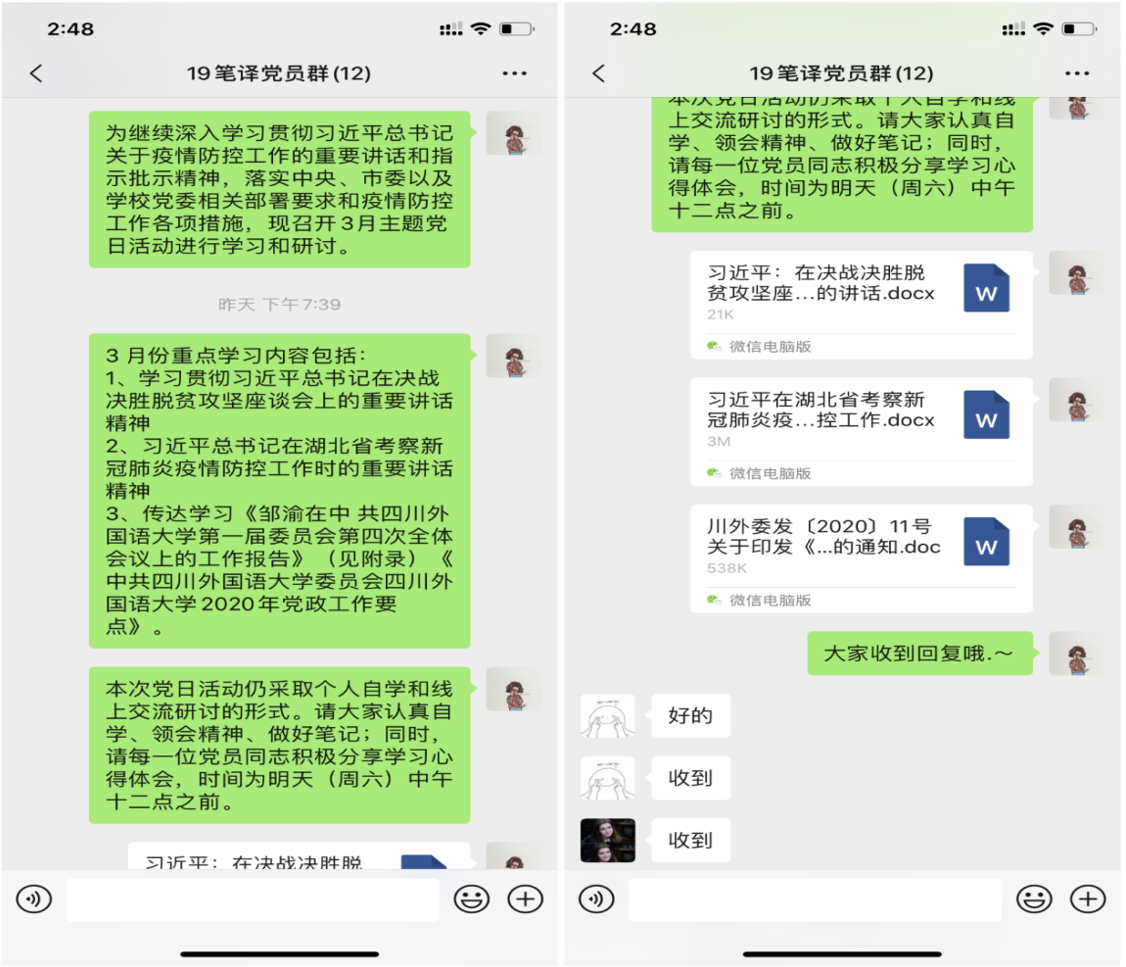 活动开始前,刘苏萌同志传达了本次党日活动的内容与要求,并将活动的材料上传至群内供大家自行下载学习。此次学习的内容有:学习贯彻习近平总书记在决战决胜脱贫攻坚座谈会上的重要讲话精神、习近平总书记在湖北省考察新冠肺炎疫情防控工作时的重要讲话精神、传达学习《邹渝在中共四川外国语大学第一届委员会第四次全体会议上的工作报告》、《中共四川外国语大学委员会四川外国语大学2020年党政工作要点》。