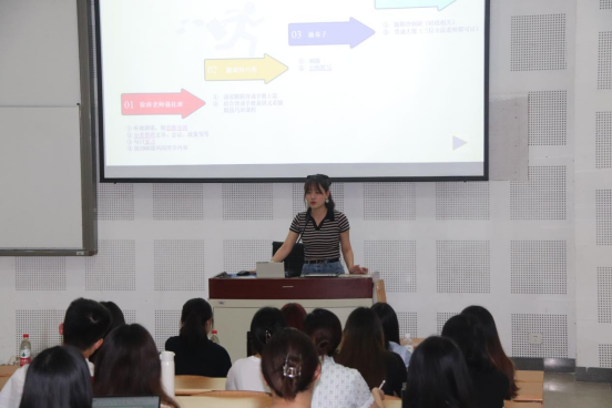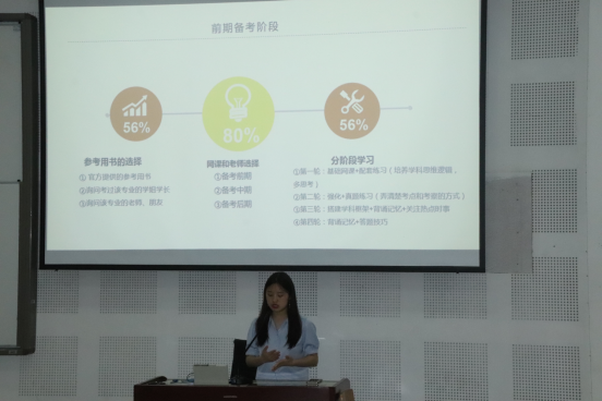 第二位进行分享的是成功考上四川大学法律硕士(非法学)专业的牟媛媛同学。她分享的则是自己跨专业考研的心路历程以及备考方法。对于跨考,牟媛媛给出了几个关键词:兴趣、努力、坚持。并着重和同学们分享了面试的技巧和方法。