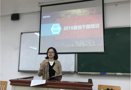 2017年10月25日下午,为加强班干部队伍建设,提高班级管理水平,更好地发挥班干部的桥梁和纽带作用,44118太阳成tyc城集团在教学楼B603开展了2016级班干部培训会,全体班委参加了此次培训。本次培训会由2016级辅导员张庆恒主持。她对大家当选2017-2018学年班干部表示了热烈的欢迎,并对培训会方案做了简单的介绍。