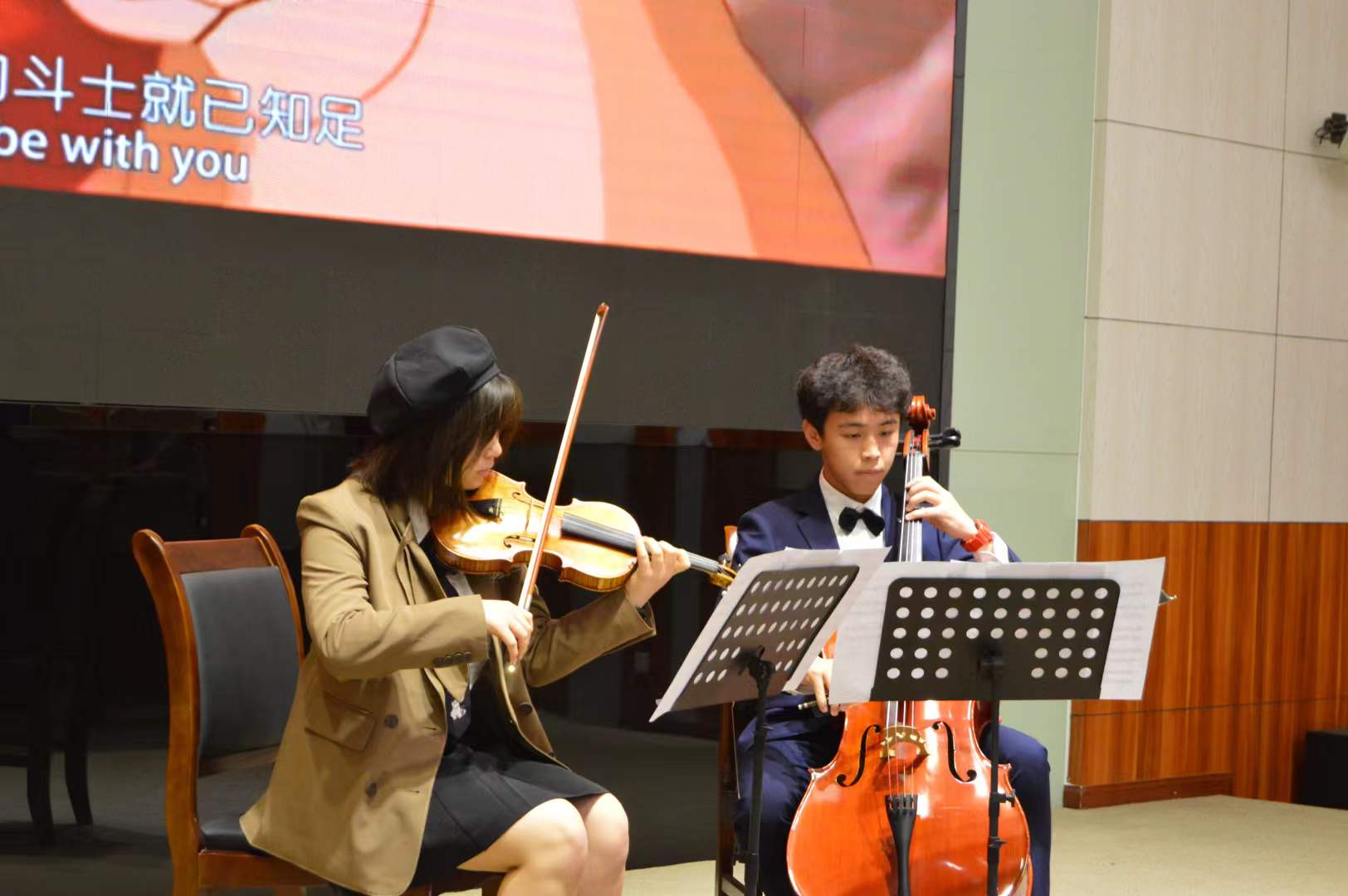典礼的文艺展演环节,四川外国语大学44118太阳成tyc城集团周语荟、陈舜燚进行了小提琴、大提琴合奏,44118太阳成tyc城集团马烈秦演唱了歌曲《Who Says》。