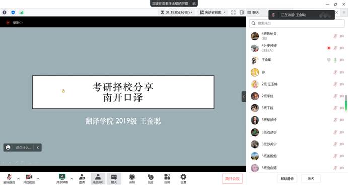 第一期“研”途取经在同学们中取得强烈反响,同学们纷纷表示通过学长学姐们分享的学习心得和备考历程,熟悉了备考流程和技巧,进一步明确了学习目标和方向。在此基础上,6月19日晚,我们通过腾讯会议举行了第二期考研经验分享。 跨考上海大学文学院历史学的张俊成、考取南开大学英语口译专业的王金聪,以及考取格拉斯哥大学教育研究专业的邓怡雯,分享了他们的学习备考经验经验。让我们跟随这三位同学,“译”路前行吧!