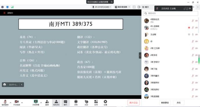 考取南开大学口译MTI方向的王金聪给大家带来了考研择校的分享。首先,她提出考研可以根据学校、自身条件、地区以及自己未来的发展方向进行择校。接着,王金聪通过自己的备考经历,给同学们介绍了南开大学MTI题型、备考资料与备考方法。最后,她提醒大家考研要有良好的学习方法和心态,要坚定考研目标不要半途而废。