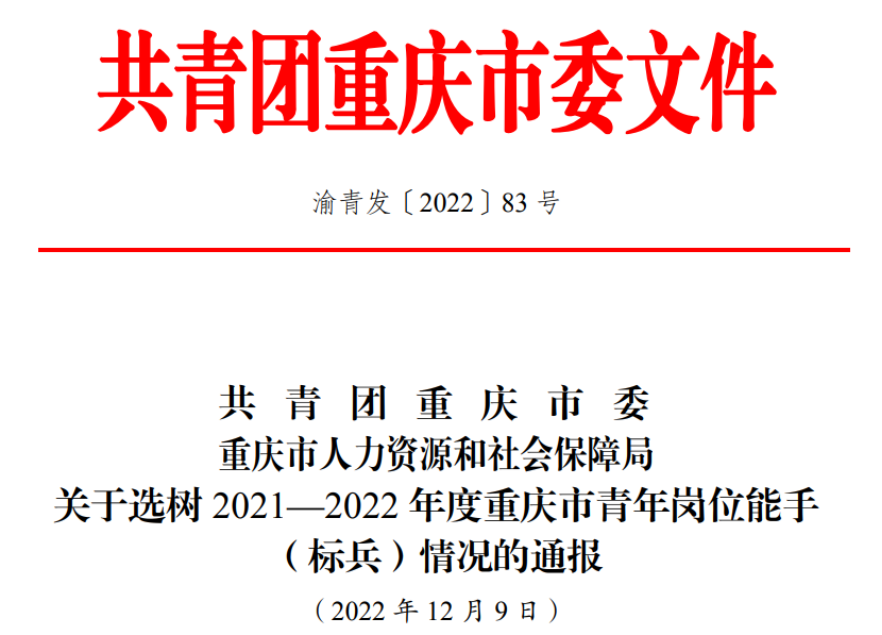 近日,共青团重庆市委、重庆市人力资源和社会保障局联合印发《共青团重庆市委重庆市人力资源和社会保障局关于选树2021-2022年度重庆市青年岗位能手(标兵)情况的通报》,经择优遴选、严格把关、集中评审和社会公示,我院教师李希希被授予“2021—2022 年度重庆市青年岗位能手”荣誉称号。