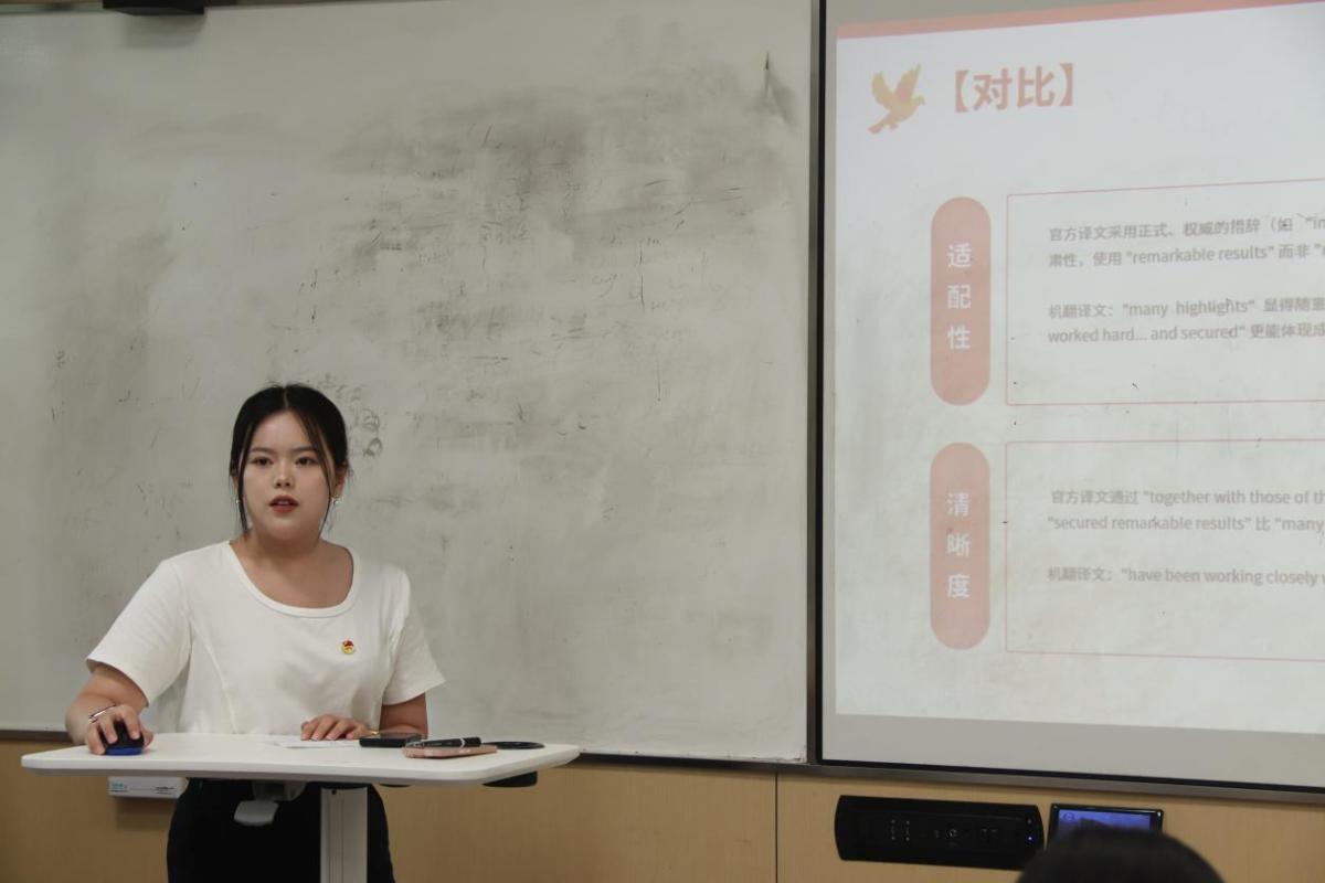 文段分析环节,六位团员代表对比分析官方译本和机器译本的差异。研究生2024级口译1班苏清慧从用词、句式结构、文化内涵三方面对比官方译文与DeepSeek、百度、DeepL的机翻,分析了“不可磨灭”等四字成语的翻译差异,凸显官方译文在情感表达和文化传递上的优势,让团员们了解高质量翻译的重要性,学习如何在翻译中准确传达原文的思想和精神。
