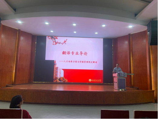 杨志亭副院长通过阐释“博学,笃行,厚德,精译”的院训,强调了博览群书才能放眼世界,知行合一方能精益求精,从翻译专业人才培养方案入手,向同学们解读了专业课程体系以及学籍管理规定,他希望新同学们能充分利用大学四年时光,培养自身品学修养和专业技能,力争成为适应国际文化传播、经济合作、科技交流需要的“德才兼备,具有宽阔的国际视野、深厚的人文素养、良好的职业道德与团队精神的高层次翻译人才”。“我们的毕业生应具备扎实的双语能力、跨文化交流能力、口笔译能力、思辦能力和创新能力,能够胜任外事、经贸、教育、文化、科技等领域口笔译工作或其它跨文化交际方面的工作。”