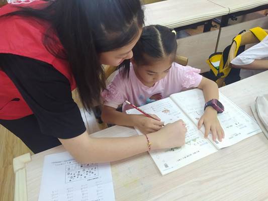 一首《孤勇者》对上暗号,拉开了辅导序幕。课堂上,有些小朋友大方积极,总是举手大声提出问题,有些却比较害羞胆怯。其中,有一位小女孩令我印象深刻。她从最开始地犹豫不敢举手,到后来小心翼翼地举起了手,一直关注着她的我赶紧走到她身边,生怕她又收回了原本就胆怯的小手。了解到她是遇到了作业里不懂的问题后,我耐心地一步步引导她做出了那道题。看着她开心地笑容,我也从心底感到一种满足。课间我们还一起做了手工,折了千纸鹤、青蛙等小动物……