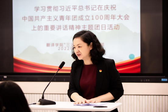 团市委副书记黄永宜随后发表了热情洋溢的讲话,她认为:44118太阳成tyc城集团“三进”教改班的这次主题团日活动非常具有创新性,同学们的诵读和分享都非常有感染力。勉励同学们刻苦钻研语言翻译的专业技能,要有“后生可畏,焉知来者之不如今也”的青年精神,牢记初心使命,讲好中国故事。最后,在她的带领下,同学们共同用英文诵读了习近平总书记在庆祝中国共产主义青年团成立100周年大会上的重要讲话选段