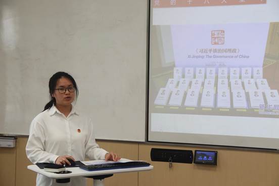 闵金桃同学首先带大家回顾了党政文献对外译介的百年发展历程。党政文献的翻译工作经历了从萌芽到壮大再到发展完善的过程。“想要理解好当代中国、传播好当代中国,一定不能忽略过去的历史。当代是历史的延续和发展,我们只有研究好历史、借鉴好历史,才能发展好未来。”