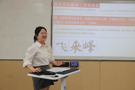 邓美云同学从“本域映射”、“换域映射”、“去域映射”三个概念入手,分析了党的二十大报告译文中部分成语典故的处理。