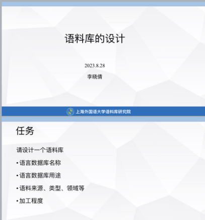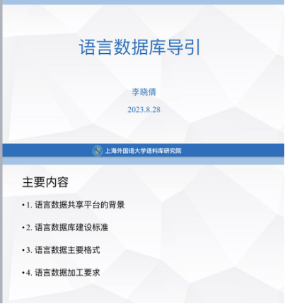 在研习会开幕致辞中,上海外国语大学校长助理、语料库研究院院长胡开宝教授介绍了本次研习会对于推动多领域、多语种语言数据的共建与共享的重要性,并对参加研习的各位青年教师寄予厚望。本次研习会5天的课程分别由来自上海外国语大学语料库研究院的李晓倩博士、上海立信金融会计学院的田旭军副教授、华东政法大学的王晓莉博士、上海语之能数据科技有限公司的肖骁工程师和赵玺媛老师、上海交通大学的朱一凡教授等专家进行讲授,涵盖“语言数据库导引”、“语料库的设计”、“语料库的建设”、“语言数据建设实操”、“语言数据共享平台的应用”、“语料库数据检索与应用”、“语言数据建设常见问题分析”、“语料库翻译学”、“语言数据与翻译研究”等主题。本次研习课程对语言数据的建设与应用相关的问题进行了系统深入的探究,对高校青年教师的教学及科研工作具有重要的指导作用。