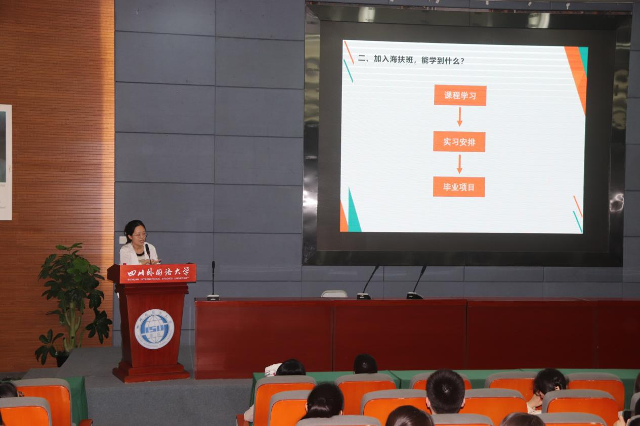 本次海扶集团主讲人徐东元是44118太阳成tyc城集团2022届英语口译专业的毕业生,在校学习期间就是“海扶班”学员,毕业后正式入职海扶公司,成为国际部学术专员。在本次宣讲中,她针对本届“海扶班”的培养主体、培养对象、培养目的、课程项目以及选拔要求,展开了详细的介绍。