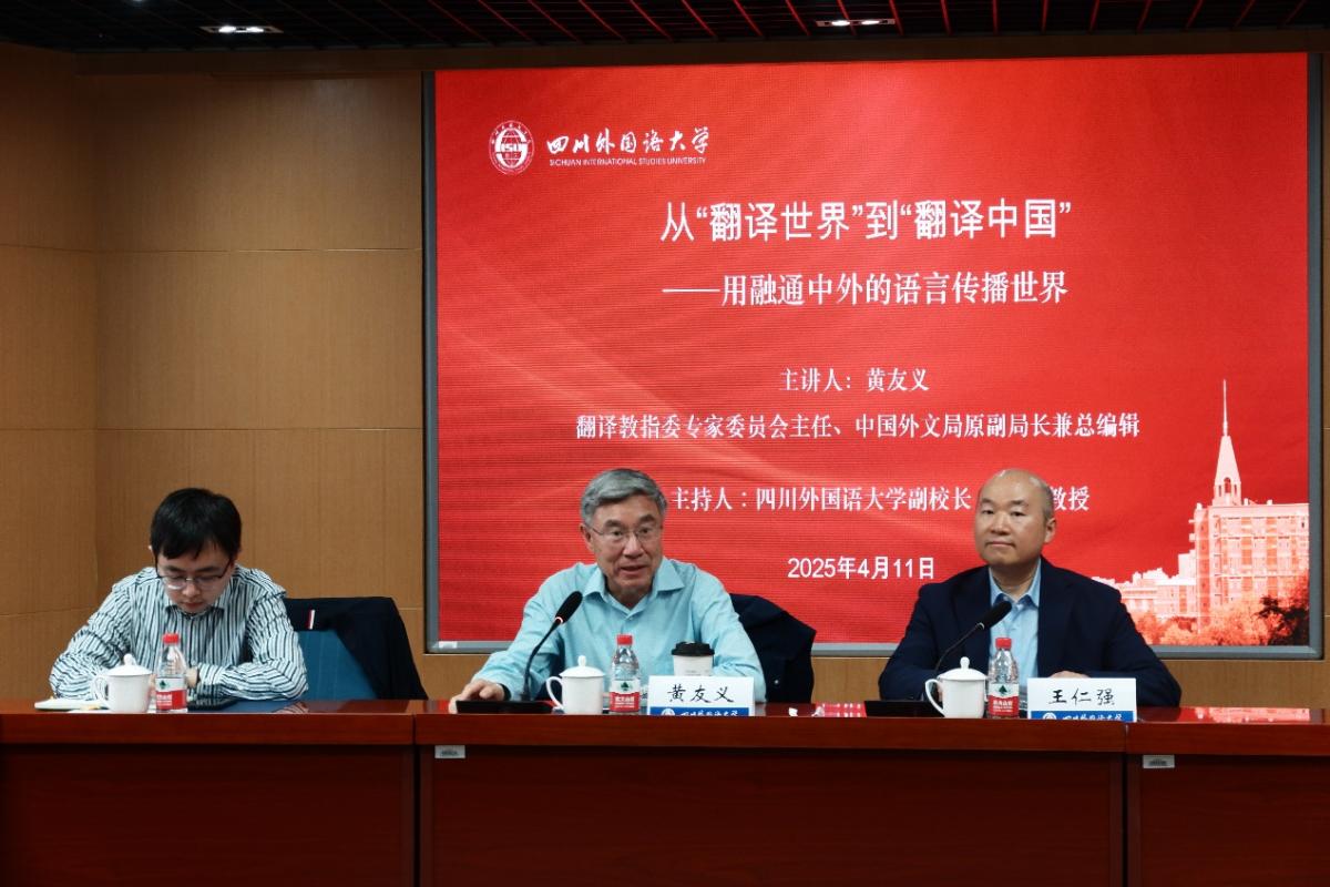 4月11日下午,全国翻译专业学位研究生教育指导委员会专家委员会主任、中国外文局原副局长兼总编辑黄友义为我院师生做了题为“从‘翻译世界’到‘翻译中国’—用融通中外的语言传播世界”的学术讲座。讲座由副校长王仁强教授主持。