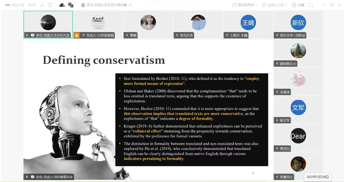 首先,三位博士生做学术分享。第一位是来自华中师范大学的博士研究生常婵,就《从“灵魂学”到“心理学”:psychology及其汉译的世俗化历程》这一主题做汇报。第二位是来自西南大学的博士研究生李佳,他的研究方向为语料库翻译学、认知翻译学研究,已发表翻译研究论文多篇,本次他的汇报题目是Is human translation more conservative than machine translation? —— A corpus-based study measuring formality across translation varieties and registers. 第三位是来自四川外国语大学博士研究生秦勤,她深耕口译教学16余载,注重提升专业课程质量,主持多门市级一流课程、教改项目,致力于推动信息技术与教育教学融合创新发展,本次她的汇报题目是《生成式人工智能时代口译教师数智素养的内涵、框架与提升路径——一项基于Nvivo的扎根研究》。