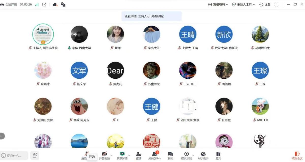 2025年3月28日星期五晚七点,巴别译谭第二十二讲以线上会议的形式拉开帷幕。本次译谭由四川外国语大学秦筱婉博士主持,上海海洋大学李涛教授、河北师范大学刘锦晖副教授和四川师范大学张静副教授点评,由分别来自华中师范大学、西南大学和四川外国语大学的三位在读博士研究生做学术分享,历时两个小时,吸引了国内多所院校的师生百余人。
