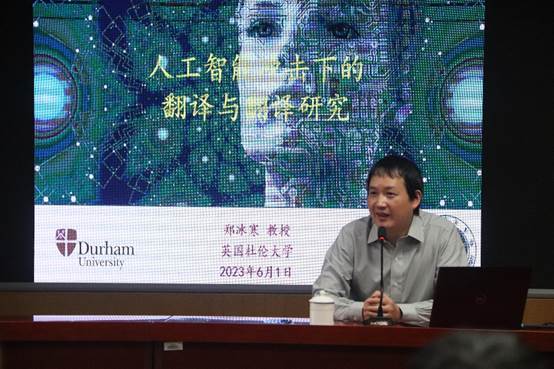 2023年6月1日上午,英国杜伦大学现代语言与文化学院终身教授,跨文化研究中心主任郑冰寒教授应邀来我院开展学术交流,并给我院同学做了以“人工智能冲击下的翻译与翻译研究”为题的学术讲座。四川外国语大学副校长王仁强教授出席讲座现场,讲座由学院院长助理李希希博士主持。
