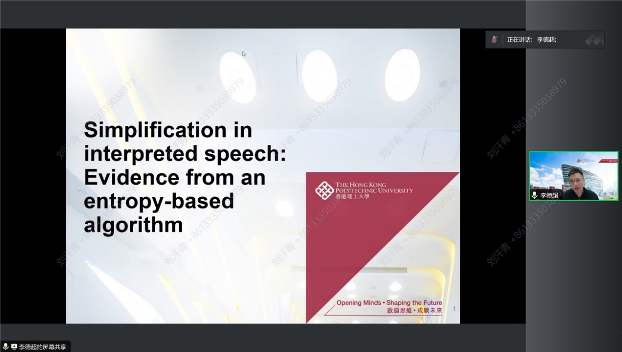 2023年11月28日下午,以“熵算法视角下口译语言中的简化特征研究”为题的讲座在线上通过腾讯会议顺利举办。本次讲座由香港理工大学中文及双语学系教授李德超主讲,四川外国语大学英语学院赵奂教授主持。