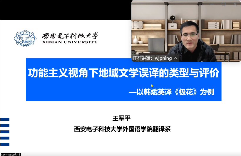 3月28日晚,翻译协会特别邀请西安电子科技大学外国语学院王军平教授,开启主题为“功能主义视角下的地域文学误译类型及评价”的重要讲座。翻译协会会长赵新雷主持讲座。