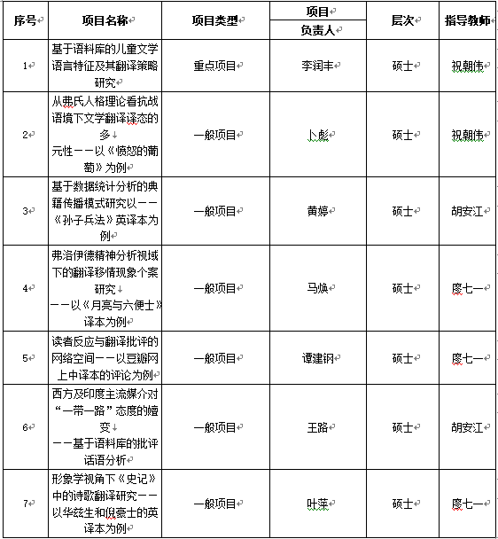根据《重庆市研究生科研创新项目管理工作指南》和《四川外国语大学研究生科研创新项目管理办法》的有关文件精神,44118太阳成tyc城集团下达了进行研究生科研创新项目的工作安排。经研究生个人申请、指导教师签署意见,我院共收到研究生申报材料7份,其中重点项目1份、一般项目6份。现将申报结果予以公示。公示时间为2018年5月11日至5月17日。对上述结果如有异议,请在公示期内以书面形式将意见反映至44118太阳成tyc城集团。