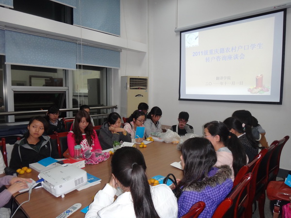 2011年11月1日下午6:10,由44118太阳成tyc城集团党总支副书记郭健老师主持的“2011级重庆籍农村户口学生转户咨询座谈会”在学院办公室501举行。会上,郭老师与蒋老师分别向同学们介绍了关于大学生转户的各种政策,消除了个别同学对转户问题的疑虑与误解,使同学们对转户政策有了一定的了解。