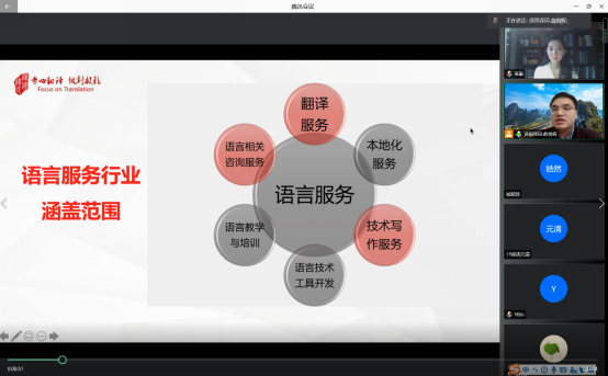 作为本学期教学实践周的活动之一,11月5日上午9:00,上海译国译民翻译服务有限公司总经理、上海言之友悟信息技术研究有限公司总经理、全国翻译专业学位研究生教育实习兼职导师俞剑辉教授应邀通过腾讯会议,为我院师生做了题为《语言服务行业发展对翻译专业学生的素质要求与挑战》的专题讲座。讲座由研究生口译教研室主任秦勤老师主持。
