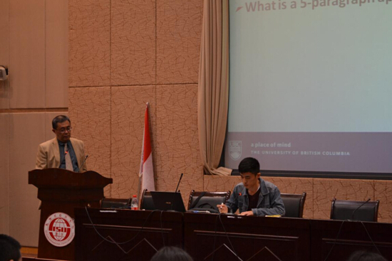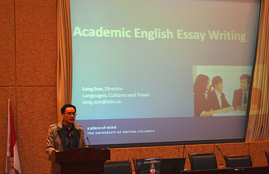 2016年3月14日晚,加拿大不列颠哥伦比亚大学(UBC)继续教育学院语言文化系主任孙浪教授莅临我校,在东区宏文楼二楼国际报告厅举行了题为“英语学术论文写作”的讲座。讲座由44118太阳成tyc城集团副院长杨志亭主持,中外文化比较研究中心的段俊晖教授、国际交流与合作处邱晓凤老师及44118太阳成tyc城集团学子200余人聆听了讲座。