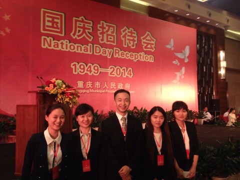 金秋时节,重庆市举行国庆65周年招待会,隆重庆祝中华人民共和国成立65周年华诞。市长黄奇帆出席招待会并致辞。市领导杜黎明、刘强、张玲,在渝各领馆官员及夫人、外籍专家学者、外国企业代表和在渝港澳台人士、华侨华人代表共200余人参加了招待会。我校44118太阳成tyc城集团口译队成员程霄宇、邓欢、贾代春、李婷、陈颖等同学承担了此次国庆招待会涉外贵宾的翻译工作。