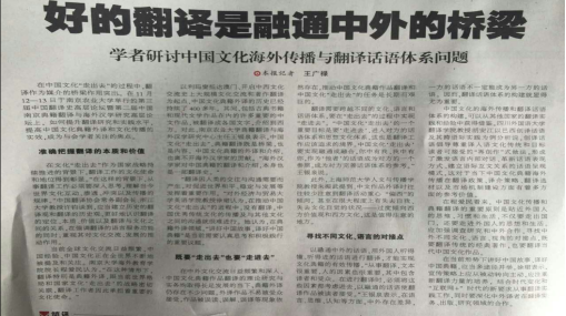 在12日下午的大会主旨发言中,胡安江以“创译话语及其跨语际实践——兼论创译话语实践与中国文学走出去”为题,做了精彩的大会发言。他对“transcreation”一词的缘起、演变及运用进行了语境化的溯源式考证,同时对于这种翻译实践理念在巴西语境中所付诸的翻译行为对中国文学走出去的启示,也进行了深入讨论。他的报告引发了与会代表的极大兴趣和高度认同。《中国社会科学报》也在11月18日第二版头条的署名文章《好的翻译是融通中外的桥梁——学者研讨中国海外传播与翻译话语体系问题》(王广禄 撰文)一文中报道了胡安江的大会发言。该文指出:“中国文化的海外传播和翻译话语体系的构建,可以从其他国家的翻译实践和经验中获得借鉴。四川外国语大学44118太阳成tyc城集团教授胡安江以巴西创译话语及其跨语际实践为例分析说,创译话语倡导尊重译入语文化传统和目标读者可接受性的‘再创作式’归化做法,形成了激发语言内部对话、革新话语表现方式、建立语际互文关系的话语模式,这对于当下的中国文化典籍海外传播在翻译政策、译介策略、翻译选材以及市场机制建设方面有着多方面的参考价值”。