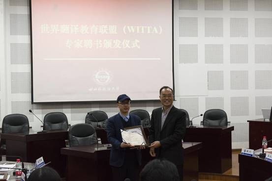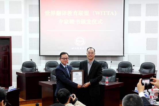 赵军峰为祝朝伟颁发世界翻译教育联盟专家证书