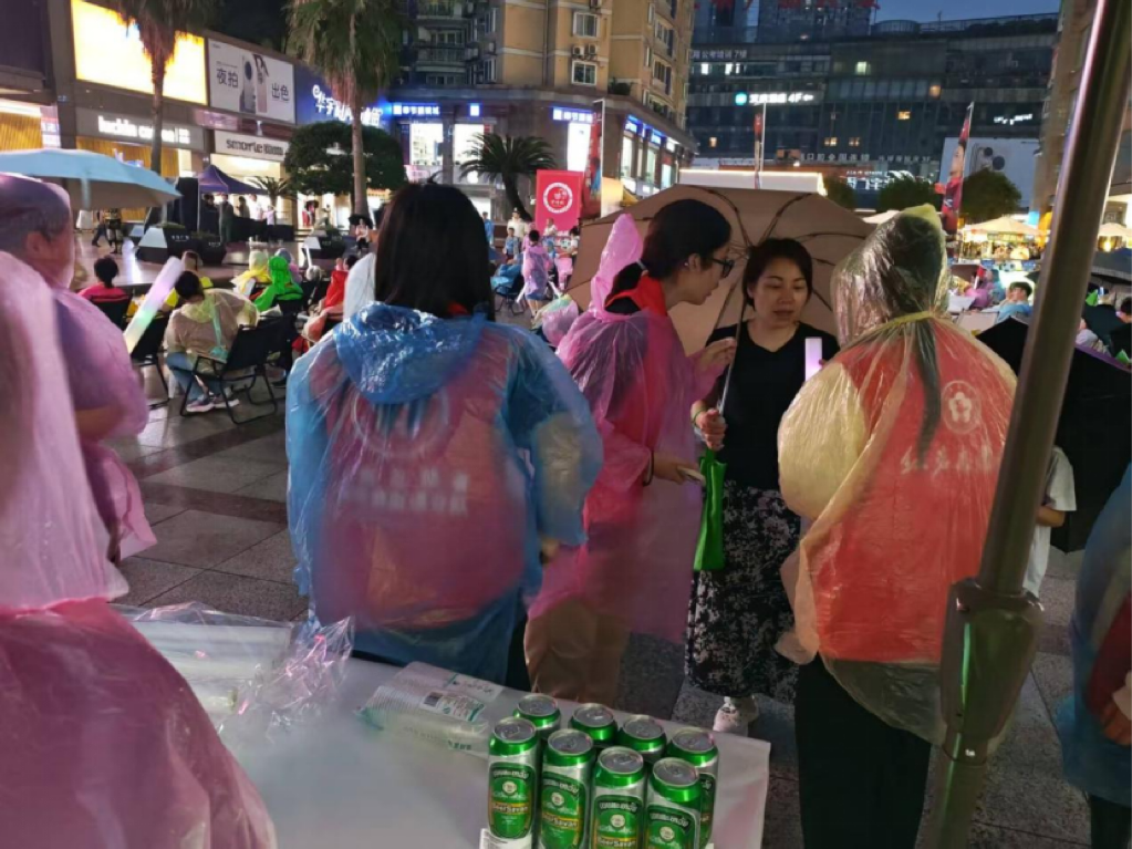 晚风渐急,现场两处摊位因风雨出现倾斜。志愿者们第一时间发现并迅速响应,协力扶正加固,确保设施安全。他们在雨中来回奔走,用行动诠释“哪里有需要,哪里就有志愿者”的担当。