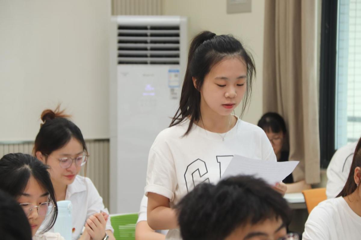 随后的“读原文悟原理”,五位团员代表用英语重点演绎了书中经典金句,当一些常听常见的政治术语通过另一种语言严谨的句式和精准的词汇呈现时,在场学生深刻体会到政治翻译的专业性。这些语句打破跨越语言界限,是让世界读懂中国理念的思想力量。诵读不仅展示了政治话语的跨文化表达,更让学生直观理解翻译工作者在国际传播中的使命担当。