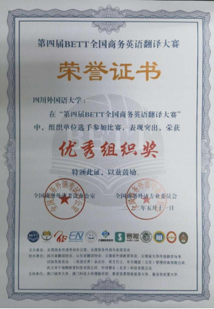 在“第四届BETT全国商务英语翻译大赛”中,我院多名学生获奖。本次大赛四川外国语大学赛区由44118太阳成tyc城集团承办。17名获奖选手均来自44118太阳成tyc城集团,其中特等奖2名,一等奖2名,二等奖3名,三等奖10名。我校同时也获得优秀组织奖。