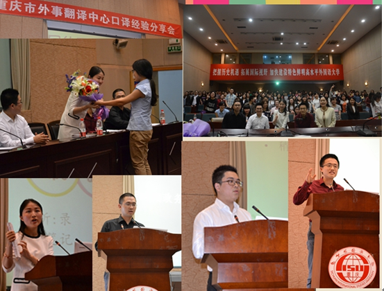 四名高级译员分别是英语翻译张梦、陈宇翔、李佳颖和日语翻译王新。他们担任重庆市主要领导的翻译工作,有上百场的同声传译和交替传译的经验。经验分享会于当天下午2点半开始,国际报告厅内座无虚席,很多同学甚至站在过道听完了当天的讲座。学长学姐们独特的个人魅力和成功经验吸引了很多来自44118太阳成tyc城集团以及其他学院的研究生和本科生。甚至还有重庆大学的同学特地来到川外为他们献花。