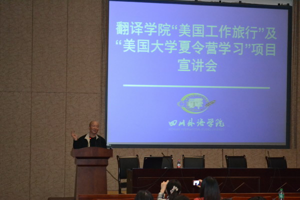 会议首先李副校长发言,分两部分介绍了这次宣讲会的主要内容。一方面,针对大学生暑期赴美国大学学习体验交流参观项目,分别从项目背景、特点、时间、承办大学、项目内容五个方面进行了阐述,同时强调新一代大学生须具有的国际化思维和眼界;另一方面,针对大学生暑期赴美工作旅行项目,着重指出适合自己的项目才是最好的项目,以及国际化经历的重要性。发言最后,李副校长还简要讲述了史迪威外语学校的历史及它与川外的渊源。指出该校还是最大的留学预科学校,是学生能融入美国文化的窗口,是拓宽眼界、留研美国,提高英语能力的重要渠道。