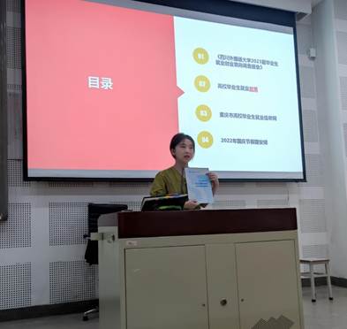 本科生就业动员会由2019级辅导员辅导员姚沁主持, 姚沁老师首先和同学们一起解读了《四川外国语大学2023届毕业生就业创业意向调查报告》,分析了目前国内升学环境竞争激烈的几点原因,就国家对大学生就业促进相关政策进行了分析和讲解,着重指出目前毕业生就业出现的“慢就业”、“缓就业”、“懒就业”等问题。最后,姚沁老师还给同学们介绍了“重庆高校毕业生就业信息网”平台的使用方法。鼓励同学们应认清自身优势,寻找合理定位,扬长避短,精准发力,及早确定就业方向,做好就业规划并积极付诸行动。
