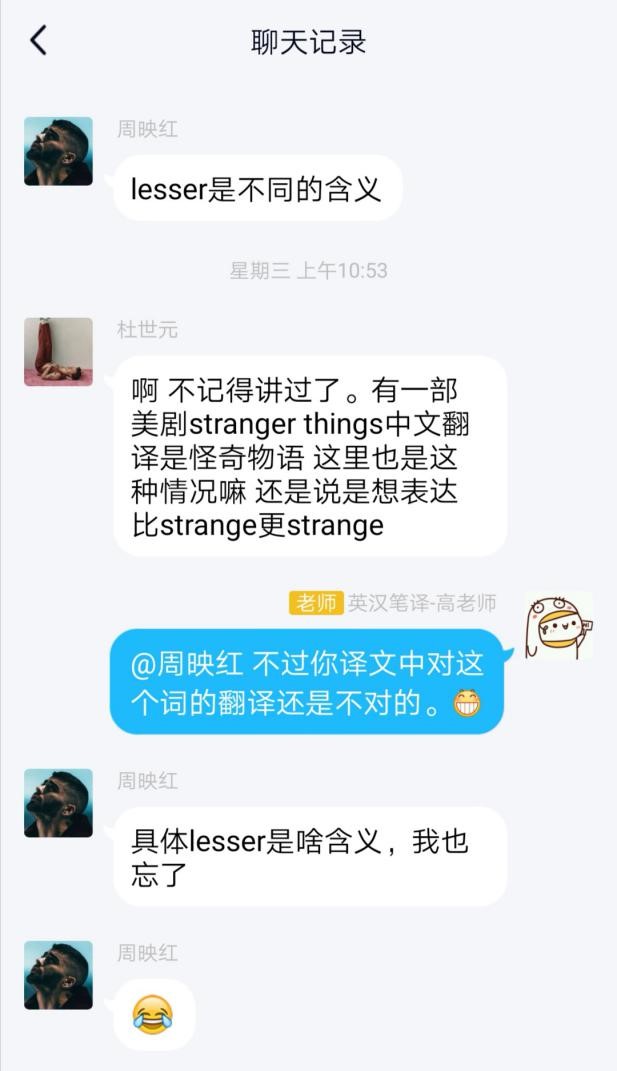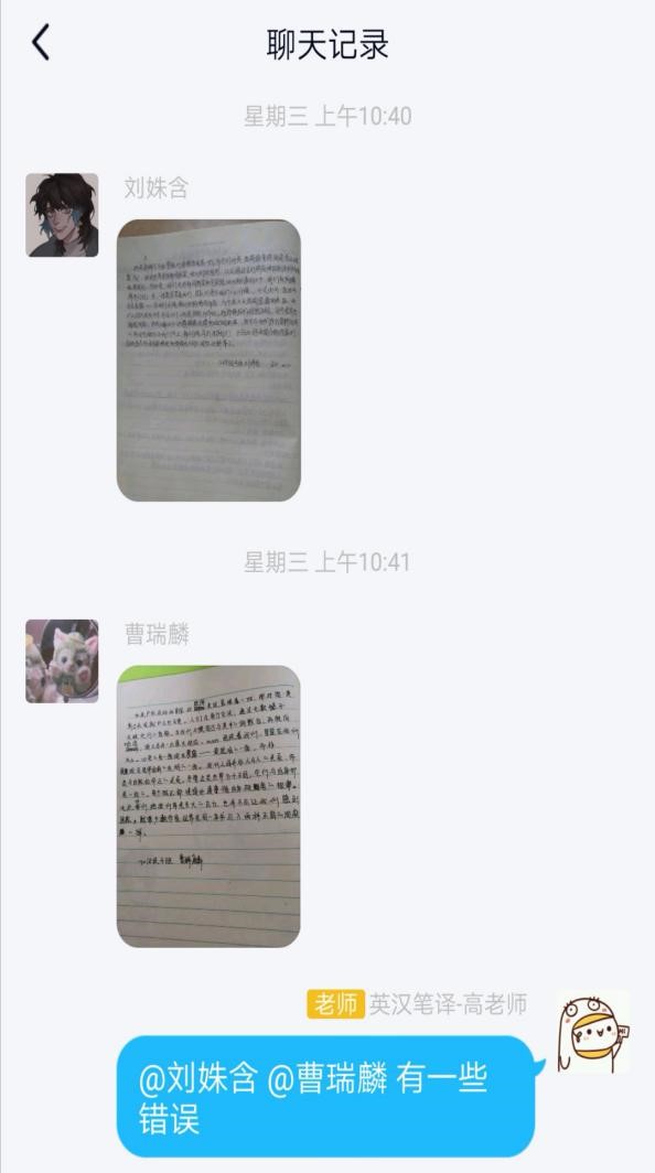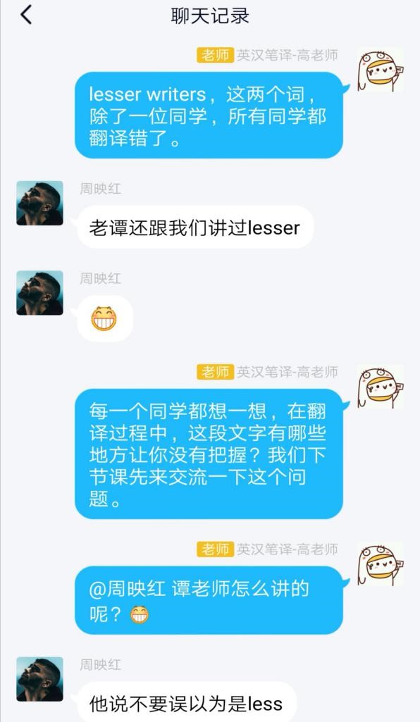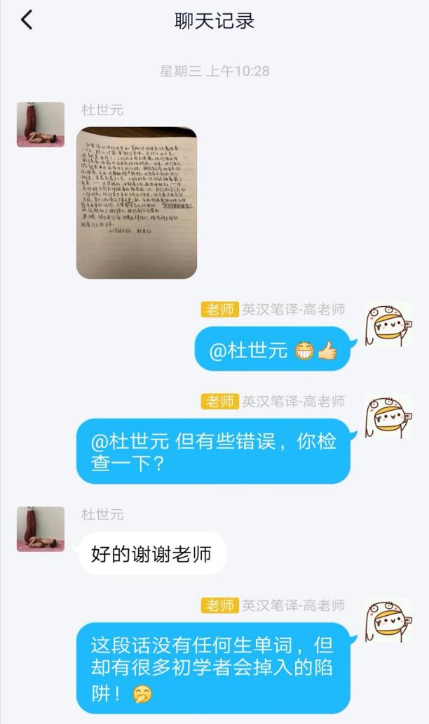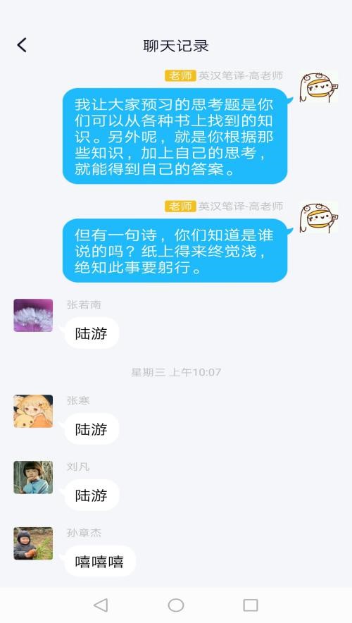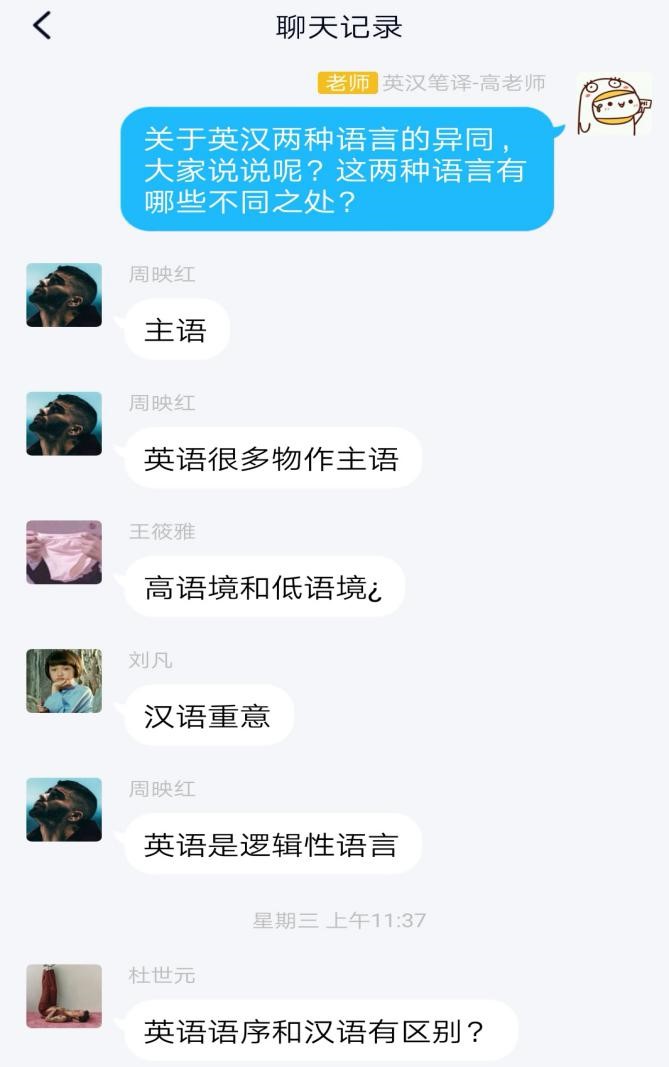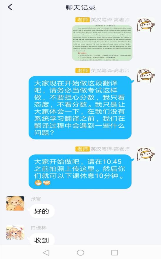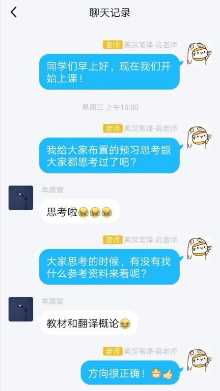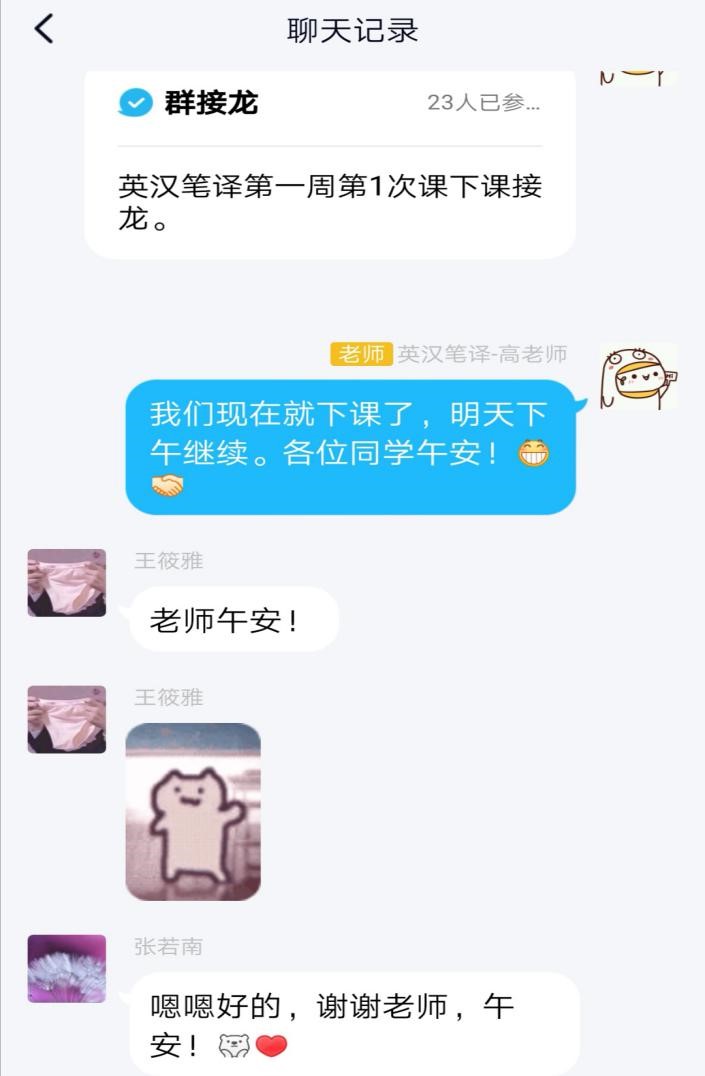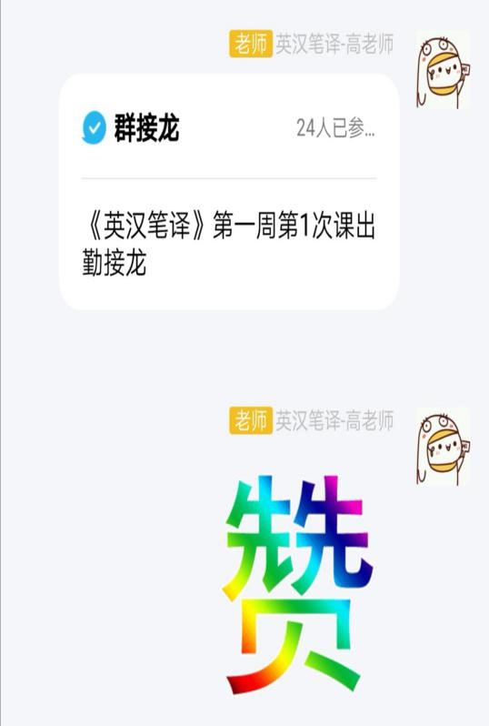 我严格按照课表时间进行网络授课。2月26日上午3-4节是该班第一次《英汉笔译》课。我提前5分钟在群里发起上课群接龙,同学们10点前完成了接龙签到。