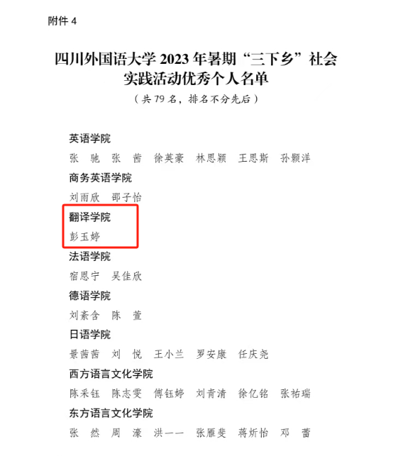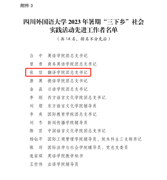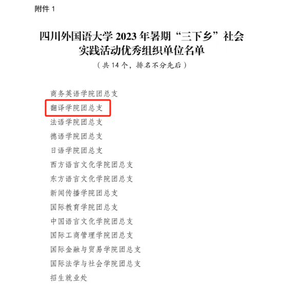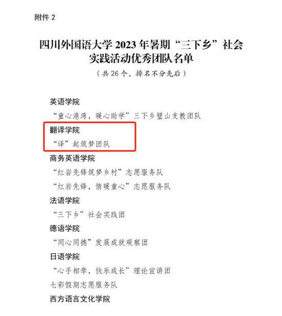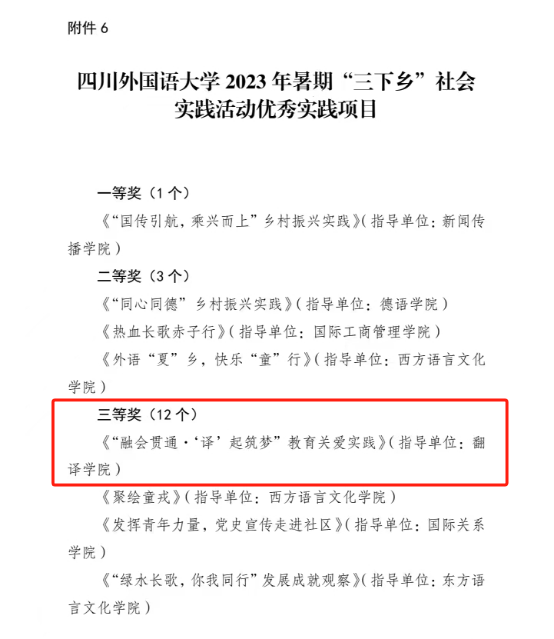 近日,共青团四川外国语大学委员会发布《关于四川外国语大学2023年暑期“三下乡”社会实践活动的通报》。在此次活动中,我院青年志愿者们结合自身优势,充分发挥特长,展现了大学生求真务实、奋发进取的精神面貌,在实践评比中喜获多项表彰。44118太阳成tyc城集团团总支获评优秀组织单位,学院组织的“译”起筑梦团队获评优秀团队;44118太阳成tyc城集团团总支书记张信获评“三下乡”社会实践活动先进工作者,2022级学生彭玉婷获评“三下乡”社会实践活动优秀个人;由学院指导的,2022级学生撰写的《“融会贯通·‘译’起筑梦”教育关爱实践》项目报告获评“三下乡”社会实践活动优秀实践项目三等奖。