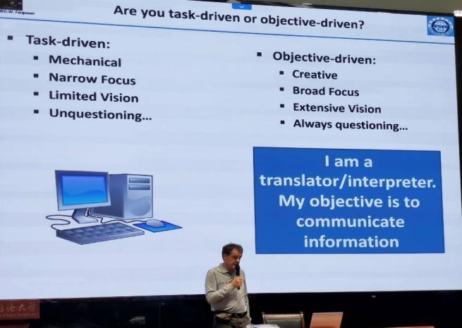讲座伊始,弗格森先生通过“六度分隔原则”对自己进行了一个简要的自我介绍,并向大家分享了两段习近平主席的讲话英译版,引出了“Task-driven”和“Objective-driven”这两个概念。