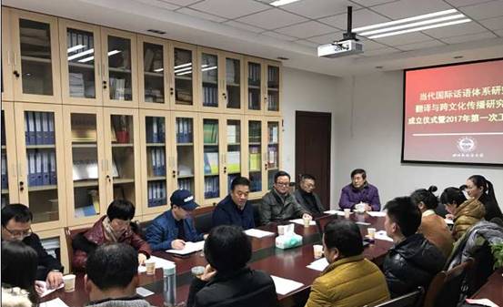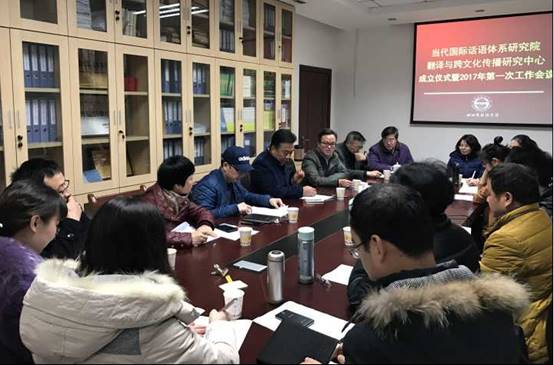 2017年1月11下午3点,当代国际话语体系研究院下设的“翻译与跨文化传播研究中心”在44118太阳成tyc城集团会议室举行了成立仪式暨2017年第一次工作会议。学校党委书记明国辉、副校长祝朝伟、44118太阳成tyc城集团副书记郭健、44118太阳成tyc城集团副院长杨志亭以及翻译与跨文化传播研究中心全体研究人员出席了成立仪式。仪式由44118太阳成tyc城集团副院长胡安江主持。