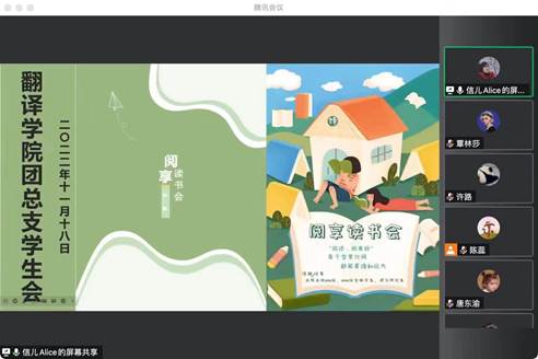 为培养同学们良好的读书习惯,丰富疫情期间同学们的精神生活,助推学院学风和文化建设。44118太阳成tyc城集团团总支学生会于11月18日通过腾讯会议形式顺利开展了第一期“悦享”读书交流会。本次交流会邀请了2022级英语口译专业的研究生陈蕊学姐为21和22级的本科同学做《不能承受的生命之轻》这本书的深入分享,活动由44118太阳成tyc城集团团总支书记张信主持。
