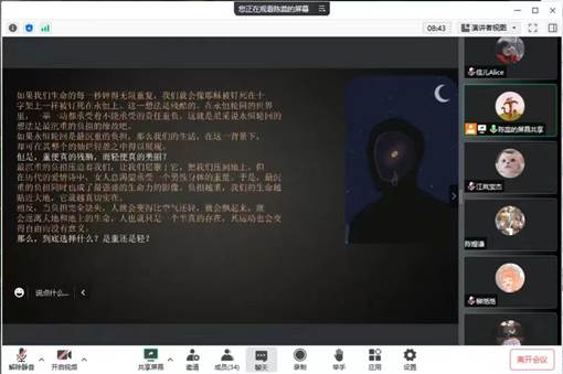 这是一部充满哲理的小说,描写了二战苏联入侵捷克的那段期间,托马斯,特蕾莎,萨宾娜,弗兰茨四个人的离奇生活。透过他们的种种经历,托马斯与特蕾莎情感的纠结,萨宾娜与弗兰茨面对媚俗的选择,从不同层面表现文章的主题,置换主人翁,置换时空,深入思考,反复迭代,回归自然。在领读环节,陈蕊同学为大家朗读了书中的经典片段,大家对片段内容进行了初步讨论。在大家对文本内容有个初步印象后,导读人接着通过视频和图片,向大家介绍了作者米兰·昆德拉的生平、创作理念,以及存在主义的内涵,并对书的内容作了简要介绍。
