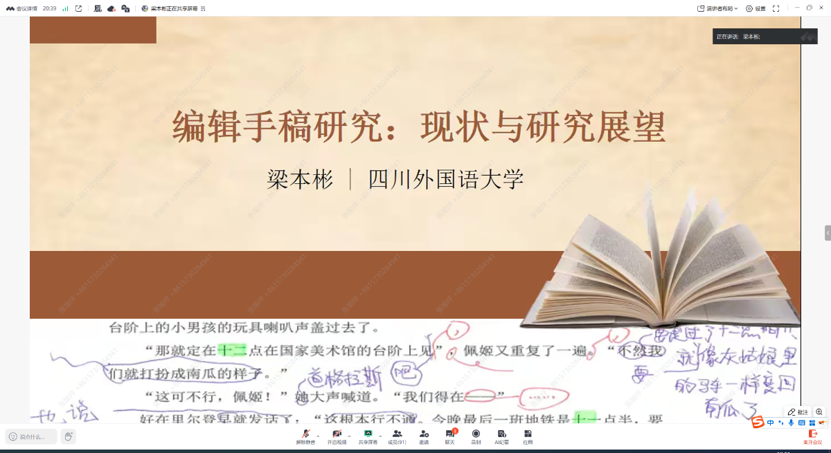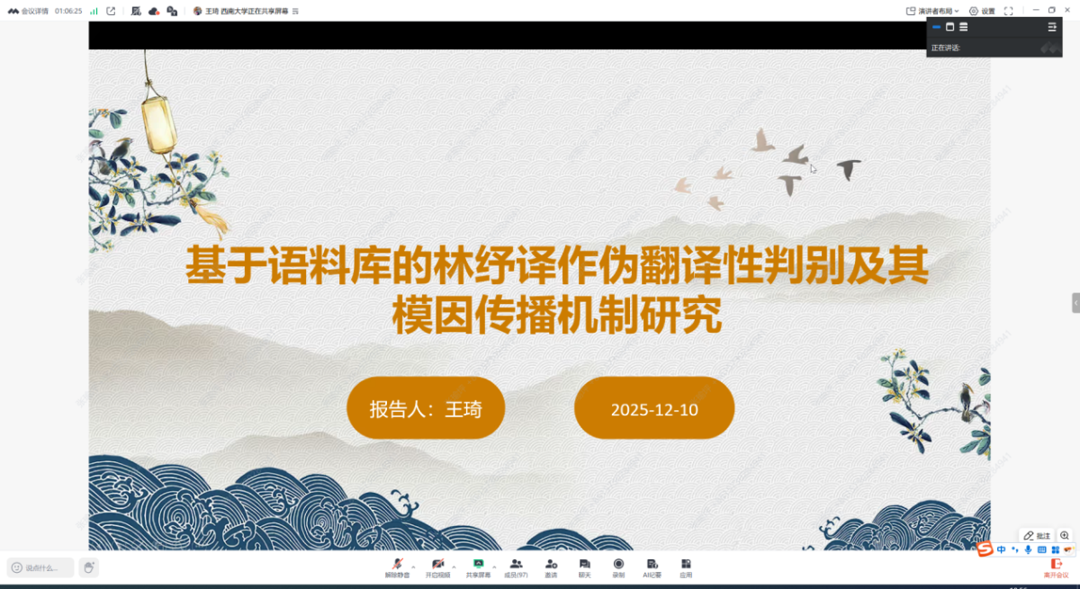 三位博士生依次做学术分享。首先是梁本彬博士带来的《编辑手稿研究:现状与研究展望》主题汇报;第二位是屈莉莉博士发言,汇报题目是《白之英译<牡丹亭>的深度阐释和文化传播》。第三位是王琦博士就《基于语料库的林纾译作伪翻译性判别及其模因传播机制研究》进行主题汇报。